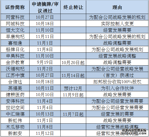 進入10月份后,截止11月12日,19家新三板公司向股轉系統遞交了申請終止掛牌的材料,其中4家公司已完成退市,從申請獲受理到收到股轉同意函,平均用時不到一個月。