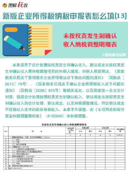 本表適用于會計處理按權責發生制確認收入、稅法規定未按權責發生制確認收入需納稅調整項目的納稅人填報。根據規定填報會計處理按照權責發生制確認收入、稅法規定未按權責發生制確認收入的會計處理等。